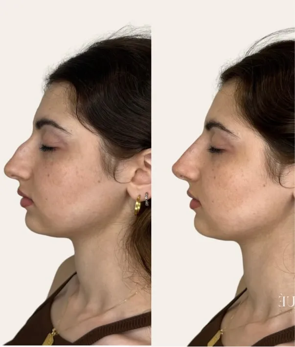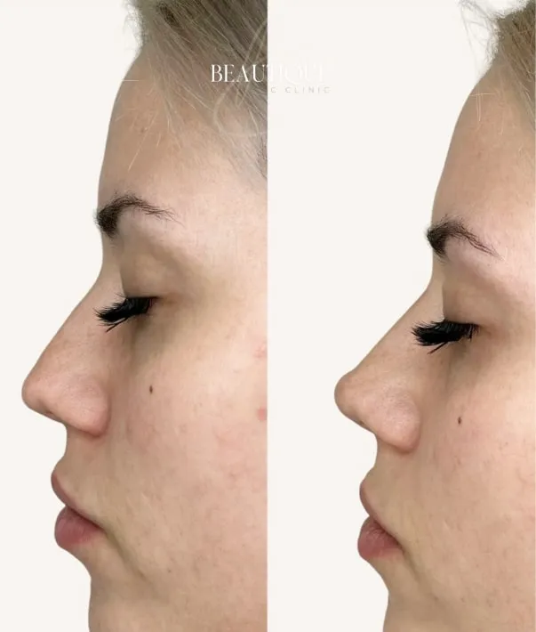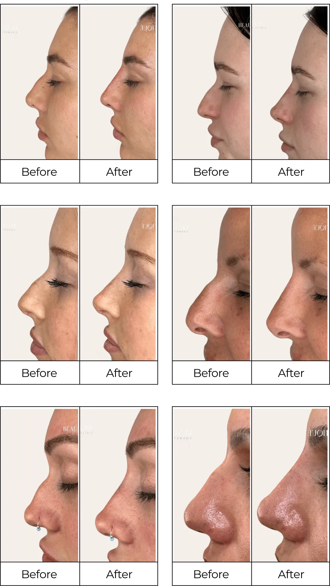 Though nose fillers don’t reduce the size of your nose, they can significantly improve its contours. By skilfully applying filler, we create a more harmonious balance, often giving the perception of a smaller and more refined nose.
